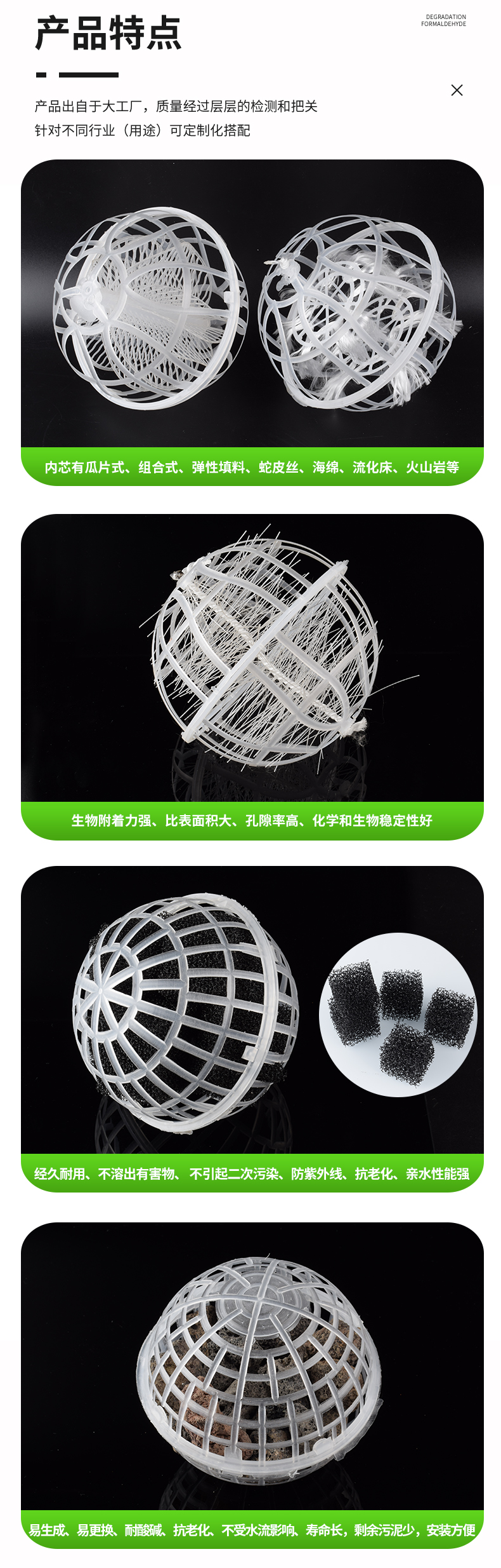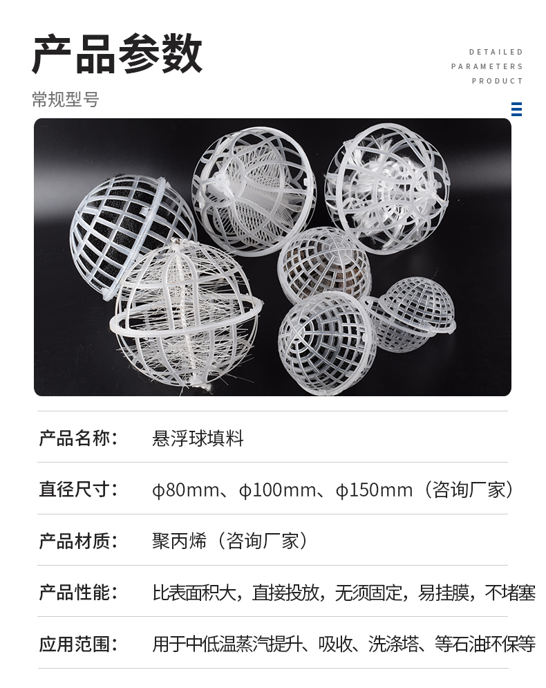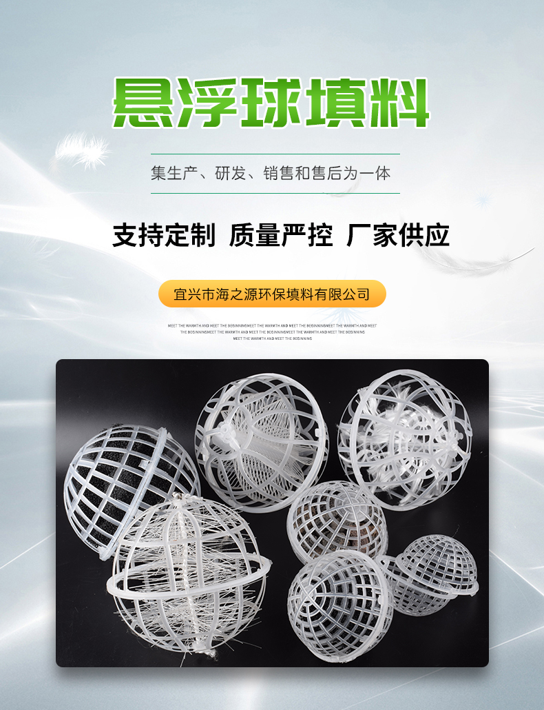 球形懸浮填料,又稱多孔旋轉球形懸浮填料,是對國內處理污水、生物膜法處理技術采用的多種填料中開發的新系列產品。在污水的生化處理中具有全立體結構,比表面積大,直接投放,無須固定,易掛膜,不堵塞。