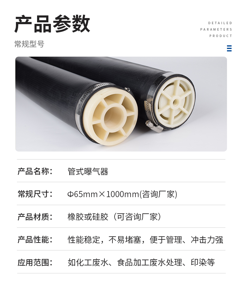 管式曝氣器構(gòu)造:曝氣膜片、支撐管、空氣管道。管式曝氣器外徑69mm,常規(guī)為580mm、800mm和1000mm。長度在580mm一下采用擠出或模壓成型,長度大于580mm采用擠出成型。膜管上一1.5mm大小、2×2.5mm的間距打孔,能產(chǎn)生直徑1-3mm的均勻微小氣泡膜管頂部有15mm長無氣孔區(qū),當(dāng)終斷供氣時膜片立即恢復(fù)原狀。對空氣入口起自動防逆流作用。
