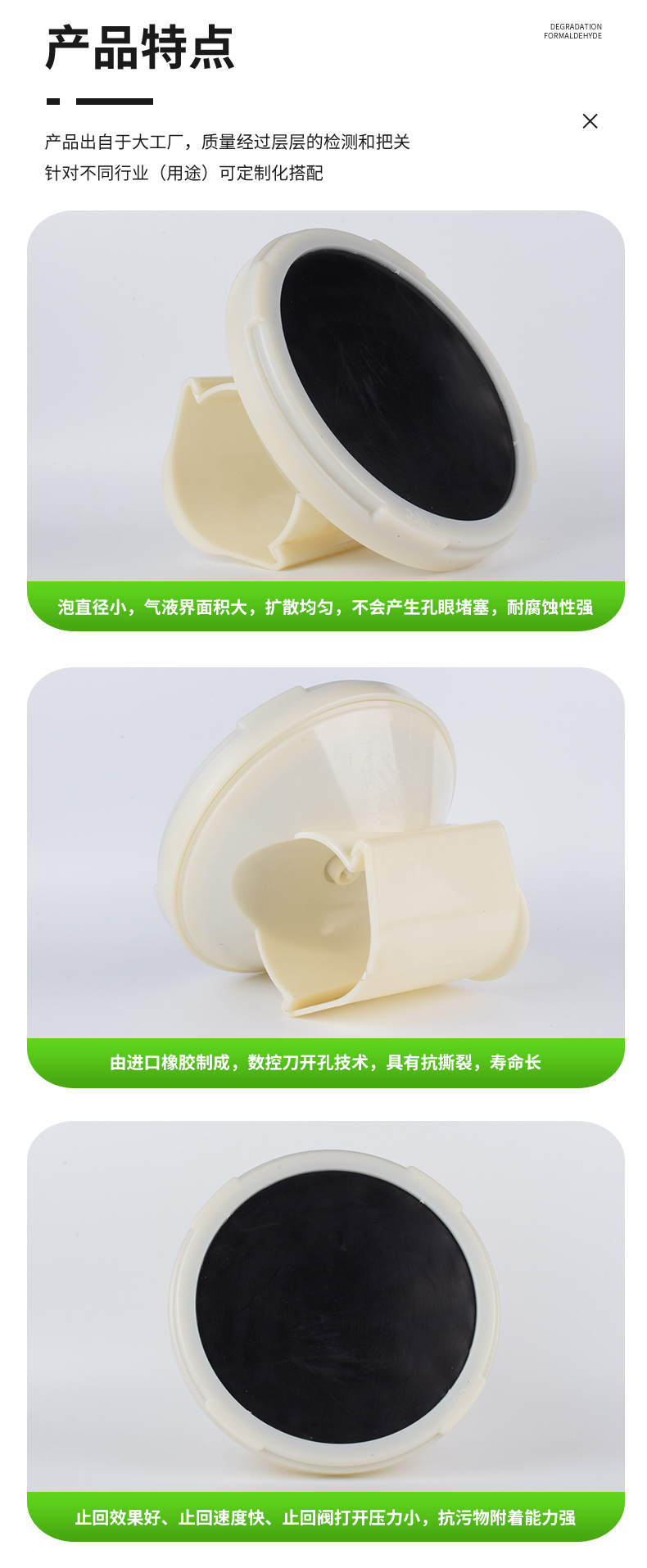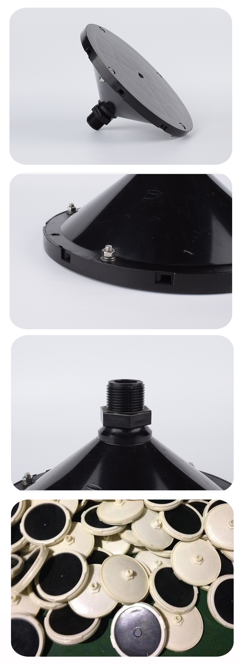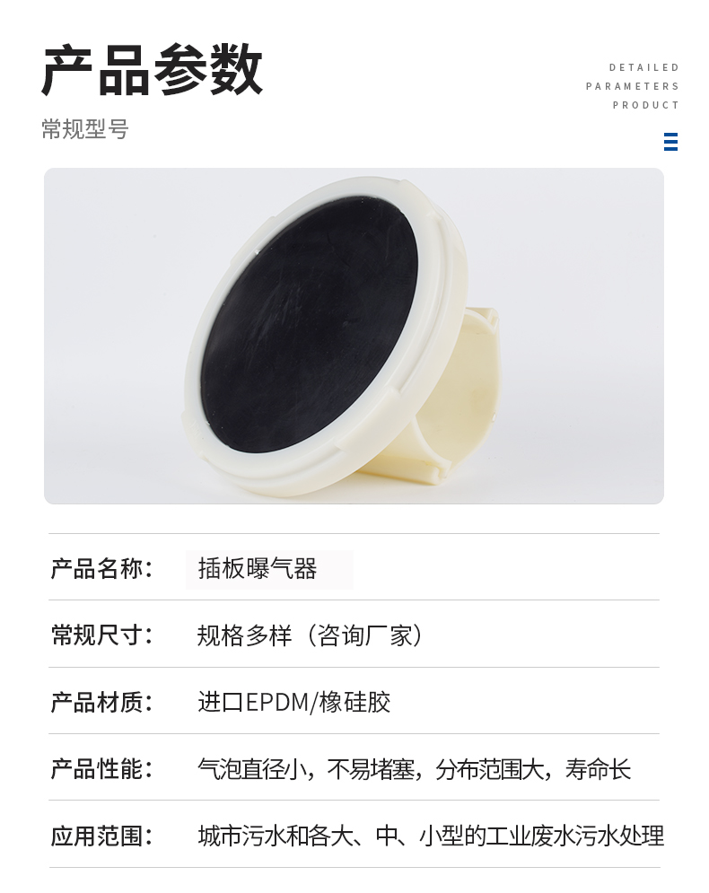 插板曝氣器由底盤、布氣盤、合成橡膠膜片、壓固圓環、空氣導流板、連接底座與配氣管連接的連接件組成。底座由ABS塑料制成,底座與壓固圓環上均有螺紋,EPDM橡膠膜片覆蓋在空氣均流板上,在固定圈的作用下能保證在膜片(周圍不漏氣,橡膠膜片在有均勻分布的孔眼,該種橡膠膜片采用多道特殊工藝加工而成,其性能穩定,耐中濃度酸、堿、油等介質。
