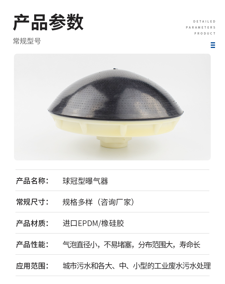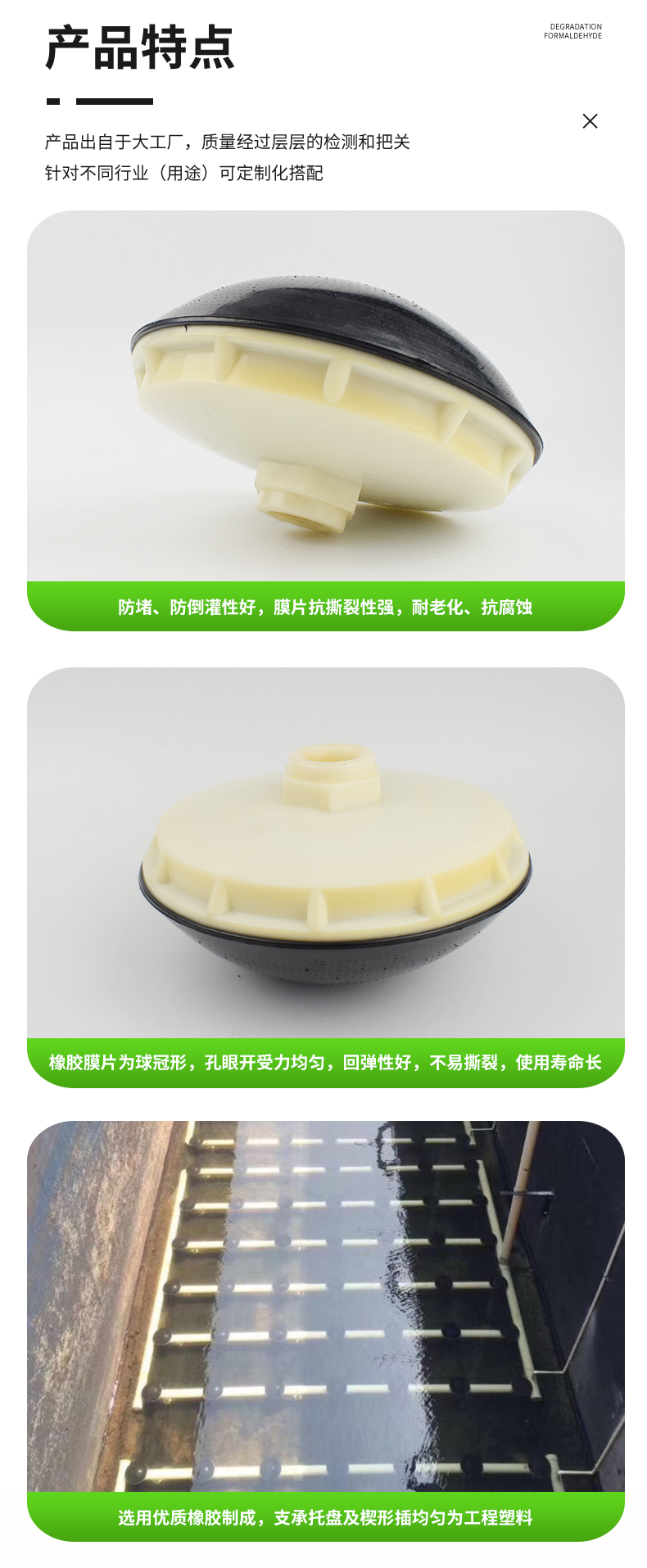 球冠bzo.w-192球冠形可張微孔曝氣器,是我廠根據(jù)污水生物處理的工藝特點(diǎn),在原膜片微孔曝氣器的基礎(chǔ)上,進(jìn)行專項(xiàng)研制開(kāi)發(fā)的新型曝氣裝置。曝氣器整體結(jié)構(gòu)科學(xué)合理、工藝先進(jìn)、設(shè)計(jì)新穎、微孔曝氣膜及支承托盤(pán)呈獨(dú)特的球冠形結(jié)構(gòu)。該曝氣器具有優(yōu)異的防堵及防水體倒流的性能。在間歇運(yùn)行工況條件下,曝氣膜表面不易沉淀污泥。較平板膜片式微孔曝氣器使用壽命更長(zhǎng),充氧效率更高,也適用于源水微污染生物處理。