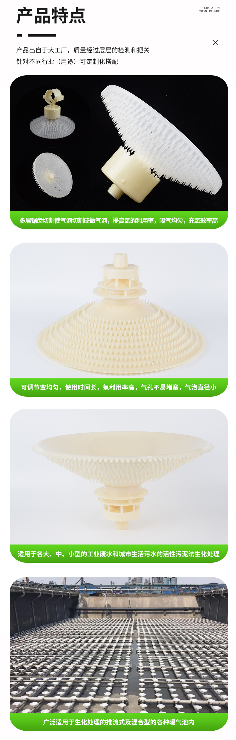 旋混式曝氣器采用多層螺旋切割的型式進行充氧曝氣,旋混式曝氣器當氣流進入260型混流型曝氣器時,氣流首先通過二道螺旋切割系統,切割后進入下層的的多層鋸齒型布氣頭,進行多層切割,使氣泡切割成微氣泡,這樣大大提高了氧的利用率,具有布氣均勻,充氧效率高的特點。