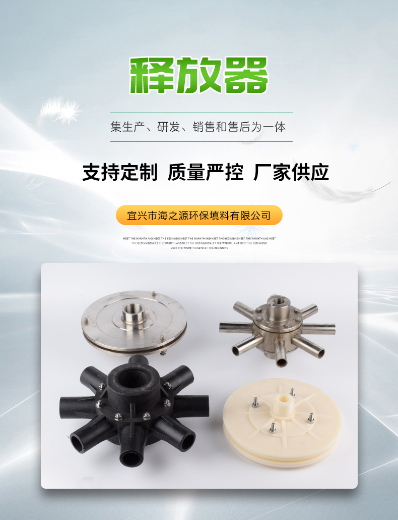 釋放器是溶氣氣浮凈水系統中關鍵裝置。壓力溶氣水只有通過該裝置降壓消能后,才能釋放出大量的微細氣泡,釋放器性能的好壞,涉及到氣泡的微細度,它直接影響氣浮法凈水的效果。本釋放器可反沖洗,不易堵塞。