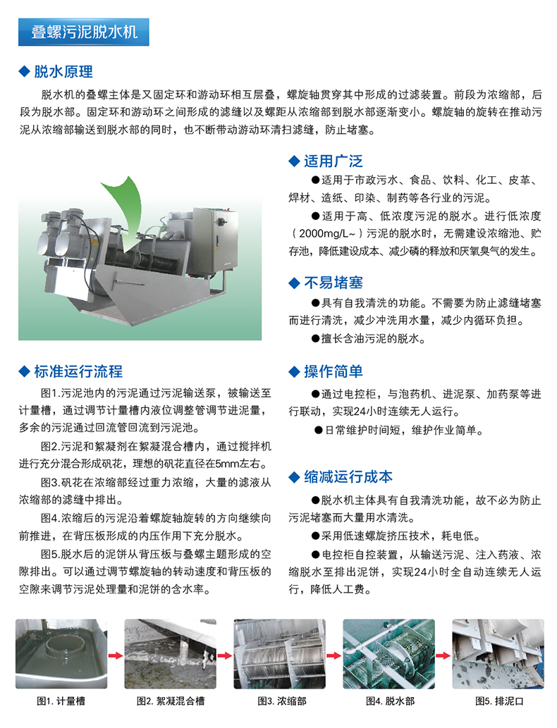 疊片螺旋式污泥脫水機是一種廣泛用于市政污水處理工程以及石化、輕工、化纖、造紙、制藥、皮革等工業行業的水處理設備