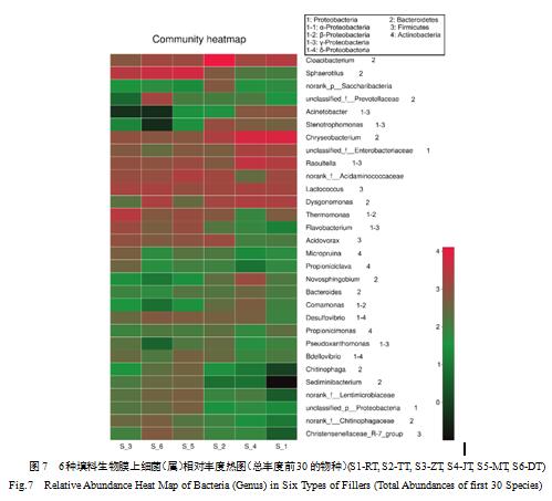 為進(jìn)一步揭示其群落結(jié)構(gòu)差異,基于細(xì)菌菌門水平(圖6)、變形菌門(表3)及菌屬水平(圖7)分析生物膜上的微生物群落結(jié)構(gòu)組成。由圖6可知,從菌門水平來看,不同填料反應(yīng)器中微生物群落組成的差異不是特別大。6種填料生物膜樣本的主要菌群均為變形菌門(Proteobacteria)、擬桿菌門(Bacteroidetes)、厚壁菌門(Firmicutes)及放線菌門(Actinobacteria)。以MT反應(yīng)器為例,其生物膜樣本變形菌門占比達(dá)56.2%,其次是擬桿菌門(25.3%)、厚壁菌門(14.8%)。其他5種填料生物膜樣本上的變形菌門占比介于28%~54.3%,擬桿菌門占比介于23.5%~57.3%,厚壁菌門介于9.2%~16.1%。該結(jié)果與前人研究結(jié)果相近,如Ma等[21]在序批式反應(yīng)器中發(fā)現(xiàn)的細(xì)菌群落組成中變形菌門(占比最大)、擬桿菌門及放線菌門占優(yōu)勢;Snaidr等[22]在常規(guī)活性污泥中對菌群多樣性的研究中發(fā)現(xiàn)變形菌門(Proteobacteria)為優(yōu)勢類群。在6個樣品中還有綠彎菌門(Chloroflexi)、浮酶菌門(Planctomycetes)、綠菌門(Chlorobi)及單胞菌門(Gemmatimonadetes)等,但所占比例均不同。其中綠菌門在顆粒化過程中有重要作用,能夠增強(qiáng)污泥的沉降性能。